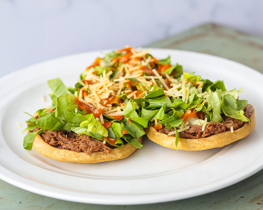 Con carne mechada, frijoles pintos, lechuga, queso parmesano y salsa Sinaloa.